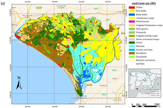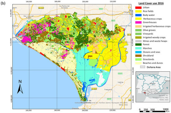 Land use on the municipalities around the Doñana area for (a) 1991, and (b) 2016.