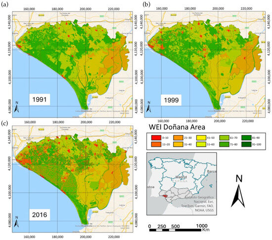 Figure 3 shows the spatial distribution of the WEI across the Doñana area for 1991, 1999, and 2016. As expected, areas with the lowest WEI values tend to cluster around cities and villages, particularly in the western portion of the study area. This observation aligns with the understanding that urbanization typically leads to a decrease in environmental value due to factors like reduced natural land cover and increased resource consumption.