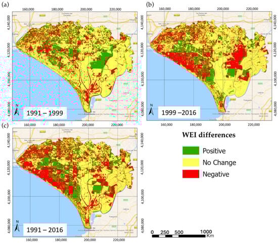 WEI differences on the study period. (a) Differences between 1991 and 1999, (b) differences between 1999 and 2016, and (c) differences between 1991 and 2016.