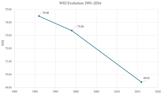 The Weighted Environmental Index (WEI) was employed to analyze the evolution of the environmental status of the Doñana area between 1991 and 2016. This analysis encompassed the park’s zone of influence, which includes the 13 municipalities described earlier and covers a total area of 2734 km2. The results obtained from applying the WEI index is presented and discussed below.