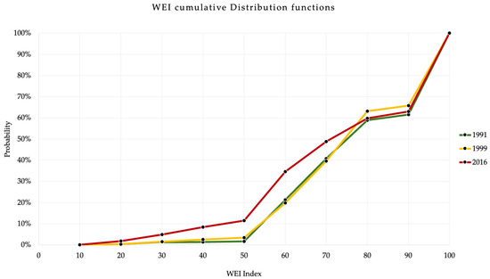 WEI cumulative distribution functions’ (CDFs) decile differences evolution (1991, 1999, and 2016).