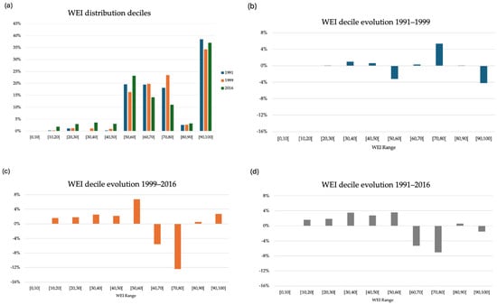 WEI CDF’s decile differences evolution. (a) Decile values; (b) incremental analysis of the CDF’s decile evolution between 1991 and 1999; (c) incremental analysis of the CDF’s decile evolution between 1999 and 2016; (d) incremental analysis of the CDF’s decile evolution between 1991 and 2016.