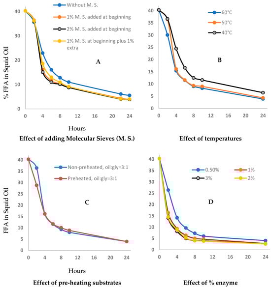 The glycerolysis of squid viscera oil releases water as a reaction product, which hinders the reaction progress and needs to be removed as the reaction progresses, to drive the equilibrium reaction forward [20]. Two methods were investigated for the removal of water, vacuum, and molecular sieves. At the 1-L scale, molecular sieves were the more effective, although it is the less scalable option [24,37,38]. We compared the effect of adding up to 2% m/v low-cost inert aluminosilicate beads, either before or during the reaction (detailed in Table 1). The other parameters were selected based on the preliminary enzyme screening experiments: stirring at 400 rpm in the custom-designed reactor at 50 °C, 3:1 oil to glycerol and 1% m/v Lipozym RMIM enzyme. A reaction time of 24 h was selected for all experiments to ensure reaction completion. The experimental data (Figure 2A) show that the addition of molecular sieves resulted in a faster reaction and a 2% improvement in FFA after 8 h and 1.5% after 24 h, irrespective of the quantity added. Despite the relatively minor improvement, we elected to continue using 1% m/v molecular sieves for the remaining optimization experiments.
