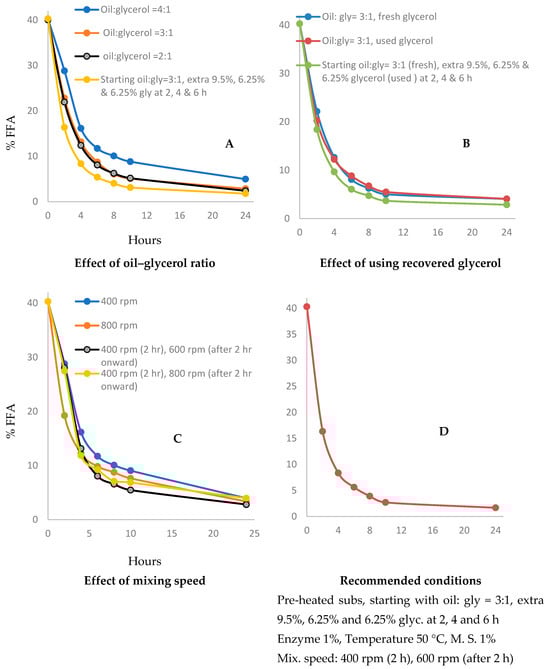 Figure 3D shows optimized reaction conditions for the glycerolysis reaction, where the pre-heated substrate of 3:1 oil/glycerol was reacted with an extra 175 mL (22% of the starting substrate volume) of glycerol being added progressively at 2,4 and 6 h (75 mL, 50 mL and 50 mL, respectively). The mixing speed started at 400 rpm and increased to 600 rpm after two hours. The reaction temperature was 50 °C with preheated substrates, 1% (m/v) enzyme and 1% (m/v) molecular sieves. Under these conditions, a reaction time of 10 h was sufficient to reduce FFA levels to 2.7%.