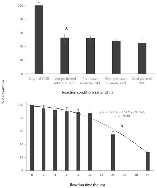 Astaxanthin content was compared for the crude input squid oil and product prepared under optimized conditions, with fresh and recovered glycerol (Figure 4A). After a reaction time of 24 h the astaxanthin content was reduced by approximately 50% showing some loss of this oxidatively sensitive carotenoid. To further investigate this partial degradation, we analyzed the change in astaxanthin content over time using the optimized conditions set (Figure 4B). Significantly, within the first 10 h, there was only a 12% reduction in astaxanthin, while the glycerolysis reaction was mostly complete. High astaxanthin degradation is observed after 24- and 48-h reactions, with the change modelled by a 2nd-order polynomial trendline with a 0.965 R2 value. Consequently, we recommend a reaction time of 10 h or less to achieve the optimum balance between neutralization and retention of EPA, DHA and astaxanthin. Oils containing EPA and DHA such as fish oil, algal oil and squid oil normally require added antioxidants for stabilization. The presence of astaxanthin, a natural antioxidant, appears to be important for stabilizing the oil and so its retention is not only important for potential health benefits, but also for oil stability.