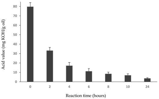 The acid value of an oil is used commercially as a measure of free fatty acid levels [42,44]. Consistent with the lipid class data obtained from TLC-FID, acid values of the squid oil decreased as the reaction progressed (Figure 5), from an initial acid value of 79.62 mg KOH/g oil to 6.78 mg KOH/g oil after 10 h and 3.54 mg KOH/g oil after 24 h.