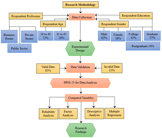 The main purpose of this study is to provide a research framework for a thorough understanding of the association between governance in smart cities and its impact on stakeholders’ satisfaction and crime rate in cities, with institutional and technological innovation acting as moderators. Longitudinal studies were conducted to investigate the hypothesis derived from this study and to evaluate the test results using SPSS. Survey questionnaires were administered for this research to assess community perceptions, and primary data were acquired. Four hundred ninety-six individuals from the public sector, private sector, and general community completed and returned survey questionnaires distributed through email and social media, allowing us to enhance construct reliability and validity [81]. The flowchart of research methods is presented in Figure 1.