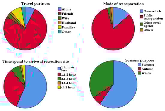 The results in Figure 2 identify the frequency of various factors related to visitors and their behaviors, such as travel partners, mode of transportation, time spent to arrive to the recreation site, season preferred for recreational purposes, days of the week, having a recreation plan for the year, travel time to visit the recreational site, and monthly income. The results show that out of the 441 respondents, 7.5% visited alone, while the majority of visitors (76.6%) visited with friends. Other travel partners included spouses (either wives, 2.9%, or husbands, 1.8%), families (8.2%), and other (2.9%). This demonstrates that the AL-Sunut Forest Reserve location is appropriate for social visits between family members and friends, and it reflects the behavior of reserve visitors among the respondents. Most people (81.6%) used public transportation to reach the recreation site, while 13.6% used personal vehicles. A small percentage reported using other travel agents or other means of transportation. This shows that visitors to the AL-Sunut Forest Reserve site use different modes of transportation. Additionally, the results found that the majority of visitors (56.7%) spent one hour or less to reach the recreation site, while 32.2% of the visitors spent 1.1–2.0 h traveling to the site. Therefore, it is crucial to maintain the road networks leading to the forest to ensure that visitors have a comfortable journey.