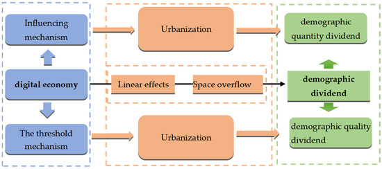 The digital economy, driven by digital technology, represents a new form of economic structure. Its vigorous development has provided fresh opportunities and motivation for urbanization. Grounded in the “technology–economy” paradigm theory, the evolution of the digital economy inevitably involves the remolding and upgrading of new technologies, thereby inducing significant structural changes during the development of the new economic landscape. This transformation brings about novel behaviors among economic urbanization entities and alters the dynamics of urbanization relationships. In China’s endeavors towards the construction of a new urbanization model, the digital economy will serve as a catalyst for urbanization development through pathways such as digital transformation initiatives, the application of digital technology, and the use of inclusive digital finance, thereby having a conspicuous impact on population dividends. The development of the digital economy has spurred the widespread adoption of remote work and online collaboration initiatives, reducing people’s reliance on cities. Firstly, the digitized work environment enables individuals to work in non-urban areas, weakening the allure of cities, particularly for those seeking a better quality of life and lower housing costs [50]. Secondly, the rise of the digital economy has altered the pattern of industrial distribution. Technology companies and innovative enterprises are more dispersed and no longer concentrated solely in traditional cities [51].