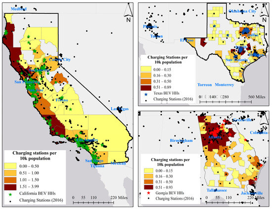 Location of BEV households and charging stations in California, Texas, and Georgia.