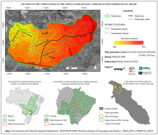 The upper course of the Ceroula stream basin has an area of 100.83 km2, is located in the far north of the municipality of Campo Grande, capital of the state of Mato Grosso do Sul, Brazil, and is part of the Cerrado biome (Figure 1). The Ceroula stream and its tributaries make up the ecological corridor of the Intermunicipal Consortium for the Integrated Development of the Miranda and Apa river basins, which are important in the formation of the Pantanal floodplain [6] and are integrally inserted in the Environmental Protection Area of the Ceroula Stream (APA of Ceroula), established by Decree No. 8264 of 27 July 2001 [7].