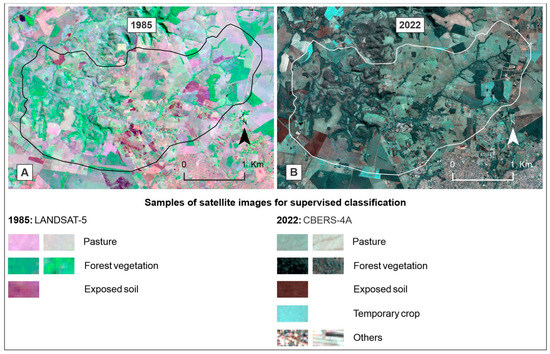 Samples of satellite images for supervised classification. (A): LANDSAT-5 image. (B): CBERS-4A image.