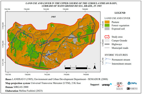 Land use and cover in the upper course of the Ceroula stream basin, Cerrado of Mato Grosso do Sul, Brazil, in 1985.