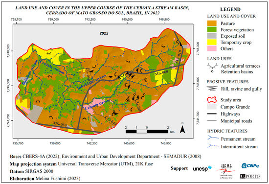 Land use and cover of the upper course of the Ceroula stream basin, Cerrado of Mato Grosso do Sul, Brazil, in 2022.