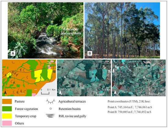 Land use and cover control points. Point (A): Leucaena (Leucaena leucocephala). Point (B): eucalyptus (Eucalyptus spp.).