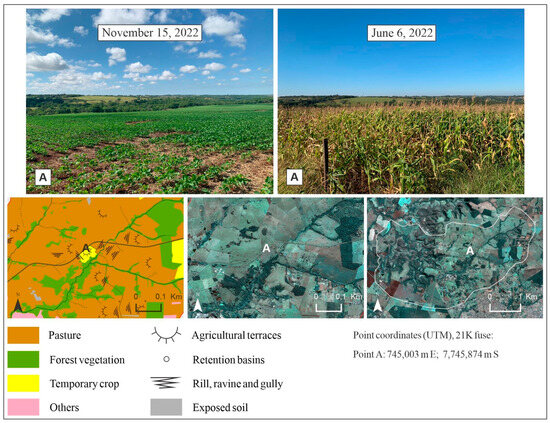In the 2022 land use and cover map, linear erosive features (rill, ravine, and gully), agricultural terraces, and retention basins were identified in the CBERS-4A image and confirmed in the fieldwork carried out in 2022 and 2023. The symbol for erosive features was adapted from Verstappen and Zuidam (1975) [11] and the representation of agricultural terraces was based on Verstappen and Zuidam (1975) [11].