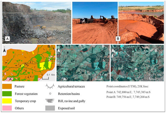 Land use and cover control points. Point (A): basalt extraction. Point (B): sand extraction.
