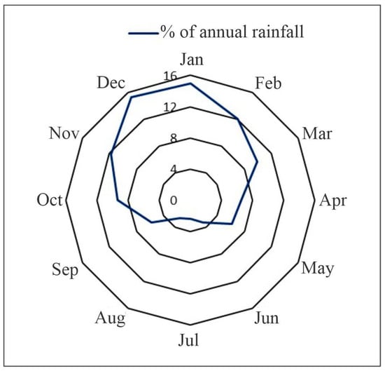Monthly rainfall concentration in the upper course of the Ceroula stream basin, Cerrado of Mato Grosso do Sul, Brazil. Source: INMET (2023); Royal Netherlands Meteorological Institute (2023).