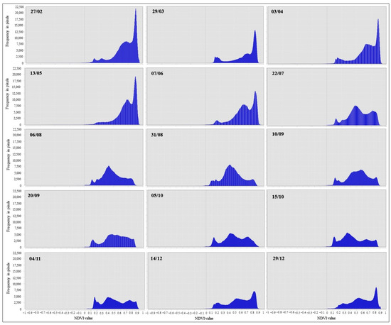 The histograms in Figure 11 quantitatively express changes in vegetation phenology and in land use and cover throughout 2023.