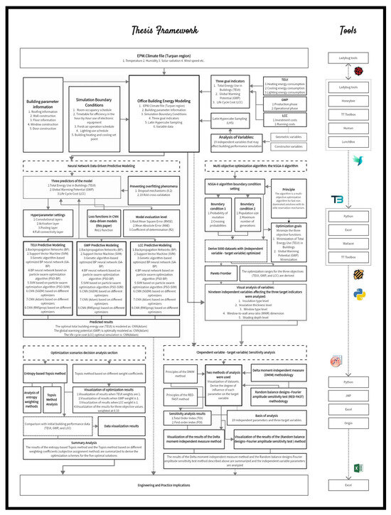 Based on the above analysis and research, the research of this paper is shown below: (1) Creating data-driven predictive models with high accuracy. Data-driven models represent a capability for fast analytical calculations with an accuracy close to that of dynamic simulations. They can be used as a strategy for conducting independent variable parameter studies and optimizing future building performance predictions. In this paper, eight data-driven models are selected to predict each of the three target indicators. (2) Multi-objective optimization is performed for three objective values. In this paper, the NSGA-II optimization algorithm is used to optimize the TEUI, GWP, and LCC, which leads to the results of the optimization scheme. (3) Decision analysis. In this part of the article, two Topsis methods are used to evaluate the performance optimization of office buildings. They are the entropy law form and the subjective empowerment form, respectively. There is use of multiple decision research methods for analysis, which in turn can increase the transparency of decision design. (4) Sensitivity analysis of variables. Two sensitivity analysis methods are used in this paper: the RBD-FAST method and the DMIM method. The article uses the method to visualize the variables analytically.