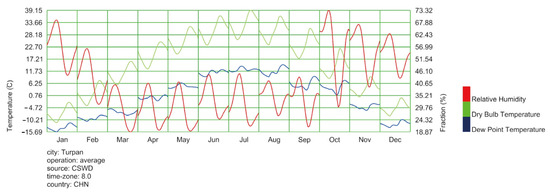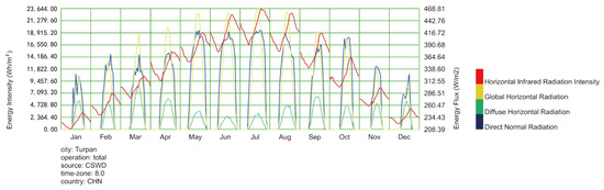The building site studied in this paper is located in the Turpan area of the Xinjiang Uygur Autonomous Region. The region is located in the eastern part of the Tien Shan Mountains and is shaped like an oval-shaped basin. It is surrounded by high mountains. The climate of the region is a continental warm temperate desert climate. In the thermal division of China, Turpan is located in the cold region. The region has hot, dry, and windy summers and cold winters. The total area of the Turpan region is 69,000 km2 and the annual evaporation is 3100 mm, but the precipitation is only 15 mm. Temperature-wise, the area is over 37 °C for one-third of the year. Temperature extremes reach 52.2 °C in summer and −28 °C in winter. At the same time, the region is characterized by strong solar radiation, with an average daily total solar radiation rate of 16 KJ. At the level of data selection, this paper selects the CSWD literature climate data information of the Turpan area. CSWD meteorological data sources are compiled by the China Meteorological Administration (CMA), which are more in line with the meteorological data used for building design in China. These data are visualized in this paper by Ladybug Tools for climate data. Figure 3 represents typical meteorological annual radiation data for Turpan Point. Figure 4 represents additional data.