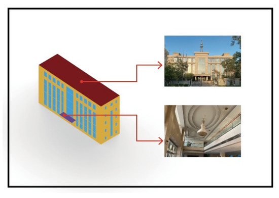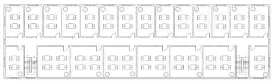 In terms of location selection, the office building case selected in this paper is located in Turpan City. The building area is 4966 m2, the number of floors is five, the height above ground is 32 m, the length is 62 m, and the width is 18 m. The building blocks are oriented east–west, with the main façade facing west, and the whole is symmetrical on the central axis. The façade of the building is in the form of a single-story glass curtain wall construction, with no snap caps on the surface of the glass curtain wall. There is a 13 m long, 4.5 m wide awning at the foyer. The east elevation of the building is framed by 70 mesh windows. The north and south elevations of the building are strips of glass curtain walls intended to provide light to the corridors. Figure 5 shows the office building portraits and models. Figure 6 shows the standard floor plan of the office building.