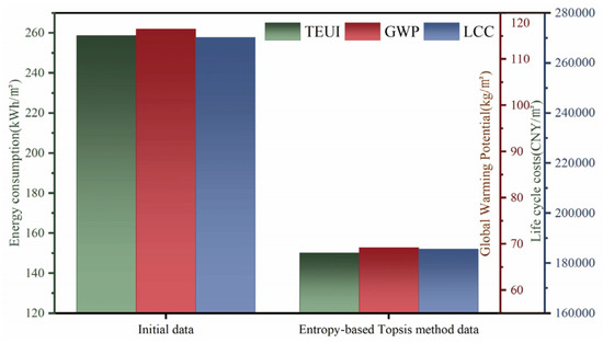In the decision analysis section, this paper uses the entropy-based Topsis method [84,85,86,87,88,89,90,91,92,93] when making decisions on the optimization scheme. The method has the following advantages: The entropy weighting method can confirm the weighting information of the target indicators by analyzing the entropy value of the target indicators of each scenario, which in turn can provide a reference for the multi-objective assessment later. Topsis analysis uses matrix extrapolation to calculate the worst and optimal solutions and then derives the distance between the objective and the first two. Finally, the closeness of each target solution to the first two ideal solutions is derived. If the indicator is close to the positive ideal solution and far from the negative ideal solution, the result is good. Finally, the above two methods are fused into one, with the entropy weighting method being used to calculate the weights and the Topsis method being used for ranking. The specific practices are as follows: