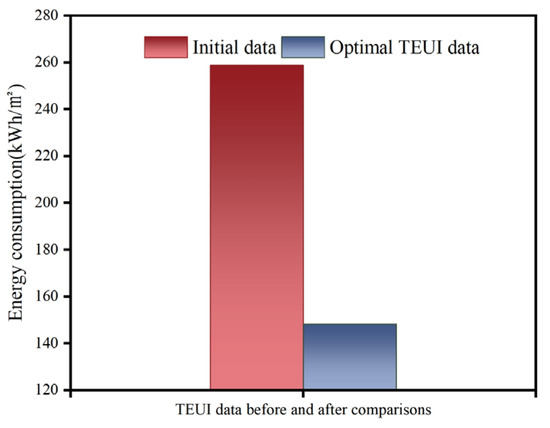 In this paper, the NSGA-II algorithm is used for multi-objective optimization of objective values (TEUI, GWP, and LCC). The algorithm is a fast non-dominated solution MOP algorithm with an elite reservation mechanism [83]. Its superior performance characteristics have been widely used in various building industry designs and green building performance evaluations. In this paper, the population size and maximum number of generations were set to 45 and 100, and the probability of variation and crossover rate were set to 0.07 and 0.90. The optimization criterion is to minimize the TEUI, GWP, and LCC objective values by adjusting the parameters of the independent variables. Its expression is: