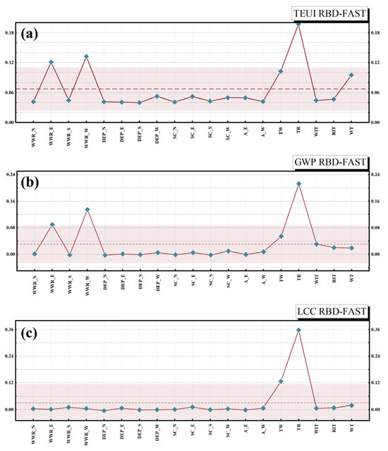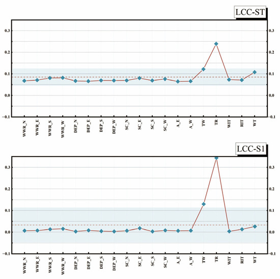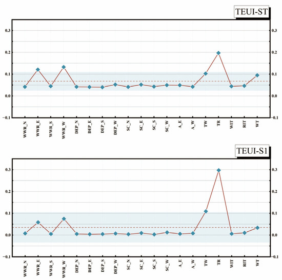 Sensitivity analysis refers to the change in the outcome of the target variable, as the independent variable changes when a variable is varied within a certain range. Since sensitivity analysis can respond to the degree of influence of characteristic parameters on the performance of office buildings, it plays an important role in green building performance analysis, retrofitting of existing office buildings, and evaluation of building performance models. Two sensitivity analysis methods are used in this paper: RED-FAST and DMIM analytical methods. The DMIM method is a density-based global analysis method with proven authority at the methodological level of sensitivity analysis [94]. It has two types of visualization of analysis results when results are analyzed on the independent variable−target variable data set, TOI and FOI. FOI indicates the contribution of a single independent variable parameter to the output results. TOI indicates the contribution of a single independent variable and the interaction of that variable with other variables to the output result. The RBD-FAST method introduces the RBD concept at the level of the FAST method and then goes on to solve the shortcomings of the FAST method, which has too many sample points and too many time costs. At the same time, it is a complementary FOI to DMIM [95].