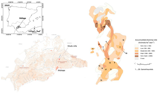 The study site was a goat farm, representative of the grazing systems of the Mediterranean mountains of southern Spain. The farm is located in the Montes de Malaga and has an area of 176 hectares (Figure 1). The study site has an altitude between 650 m and 977 m and an average slope of 40%, with maximum values that rise to 60%. The climate is Mediterranean with topographic features. The average annual precipitation is 701 mm and the average annual temperature is 14.2 °C.