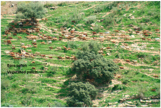 Although the herd is made up of approximately 400 Malagueña dairy goats, the number of animals that go out to pasture oscillates between 200 and 400 goats throughout the year due to the fact that during gestation periods the animals do not go out to graze. This variation in the size of the herd has been taken into consideration when calculating the stocking rate. The farm bases its feeding strategy on the availability of forage resources, and also uses supplementary feeding resources such as concentrates, oat grain, and crop residues, such as wheat straw. Grazing is based on a continuous year-long but very-short-duration grazing system, where the livestock graze on a specific area of land for a short time period (generally a few minutes) followed by a few days of rest. This grazing system favors the existence of paths created by livestock treading (bare patch), which are clearly distinguishable from the vegetated patches, i.e., those areas not affected by continuous livestock trampling (Figure 2).