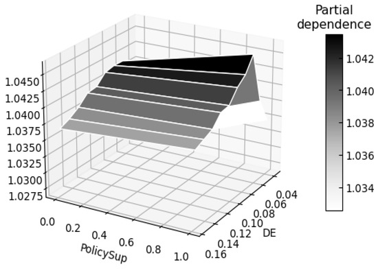 The results of the estimation using the random forest method are shown in Figure 1 and Figure 2, while the associated scores can be found in Table 5. Figure 1 illustrates the impact of various features on the outcome of the model using the Shapley value. This analysis reveals both the positive and negative effects of each feature variable on green development, as well as the ranking of their contributions. Figure 2 displays a partial dependency plot (PDP) illustrating the relationship between the feature variable and the predicted (average) green total factor productivity. The horizontal axis represents the distribution of , while the vertical axis shows the predicted (average) green total factor productivity. Figure 2 visualizes the non-linear marginal impact of the digital economy on green development.