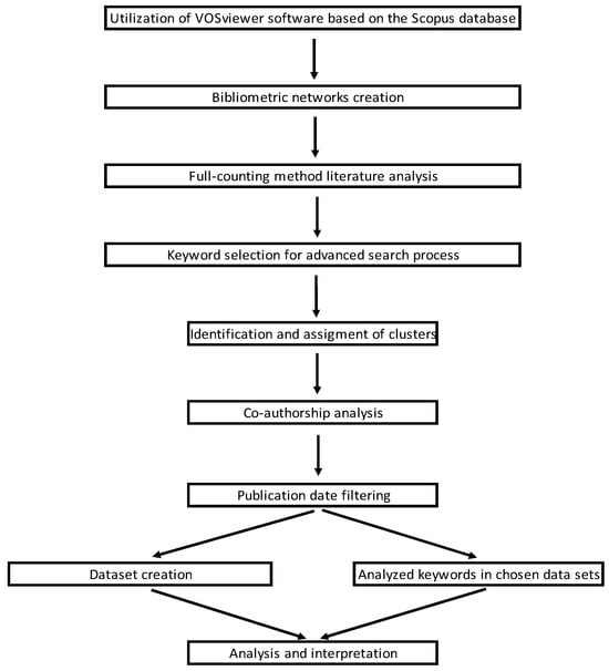 To comprehensively expand the literature review and gain deeper insights into prevailing trends in global scholarly research, bibliometric analysis software VOSviewer 1.6.20 [23] was utilized in conjunction with the Scopus database. The software facilitated the creation of bibliometric networks [24], enabling intricate network visualizations derived from carefully curated datasets. These visualizations allowed us to represent the complex web of connections and relationships within the vast body of literature explored. There are various types of bibliometric networks presented in the literature [25,26]. The literature analysis conducted was based on the full-counting method used by Gauffriau [7]. The method specifies each author of publications on an author’s publication list as 1, even if co-authors are involved. The further literature analysis drew upon a set of keywords linked to the central research problem, with specific constraints and parameters applied during the advanced search process within the Scopus database to ensure alignment with research objectives. It was recognized that the power of keyword selection lies not only in individual terms but also in their potential to synergize when paired or grouped with complementary keywords. Therefore, authors employed an approach to improve the literature search strategy by combining keywords to exploit interrelationships between them, thereby discovering articles related to our research interests. Network visualization introduced the concept of “clusters”, which emerge as groups of items sharing thematic or conceptual similarities. Each cluster was assigned a cluster number, simplifying the identification of thematic domains within the visualization. The study presents datasets sourced from the Scopus database focusing on global literature connected with educational building renovation and maintenance plans. The interpretation of selected datasets included co-authorship analysis, with specific criteria applied to ensure relevance and precision in the search process. The search was limited to specific fields, document types (such as articles, reviews, and conference papers), and subject areas, enabling a focused and comprehensive analysis of the research landscape. Another restriction targeted searches within the content of titles, abstracts, and keywords provided by authors.