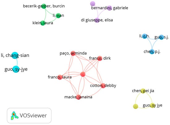 The dataset denoted as “Set 1”, containing keywords such as “maintenance”, “strategy”, “model”, and “university building”, comprises contributions from six distinct author groups, collectively generating seven documents, encompassing articles, conference papers, and reviews. These groups created six clusters, each independently formed without interconnection, indicating diverse research trajectories (Figure 2). Nonetheless, the absence of interconnection does not preclude potential collaboration among authors. Notably, Sy-Jye Guo, affiliated with the College of Engineering at the National Taiwan University, features prominently in three clusters, indicating collaborative efforts with various researchers within the scope delineated by the “Set 1” keywords. All of the papers were published in the years 2008–2012, which could lead to the conclusion that the authors abandoned research work on this specific topic.