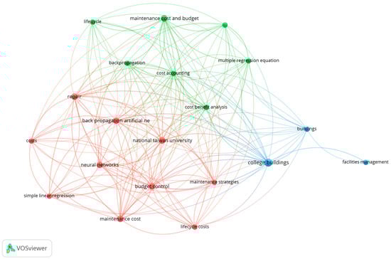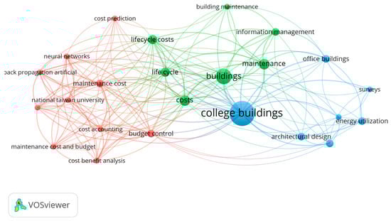 Following this, an examination of the keywords presented in “Set 2” publications was conducted. Despite the bigger size of “Set 2” in comparison to “Set 1”, a minimum occurrence threshold remained unchanged—each keyword was required to appear at least twice. Out of the keywords found, associations with the term “maintenance” were identified (keywords such as, among others, “maintenance cost and budget”, “maintenance”, “maintenance cost”, “budget control”, or “life cycle”). The visual representation of these associations is depicted in Figure 5.