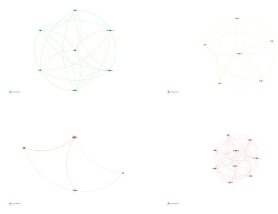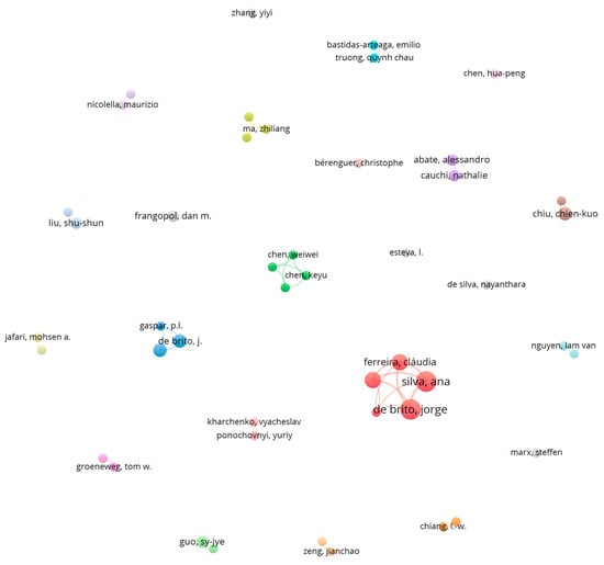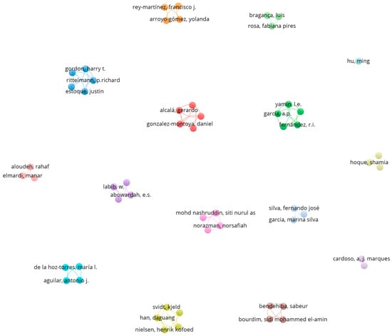 The analyzed set comprises 22 groups of authors who collectively authored 23 documents, including articles, conference papers, and reviews (Figure 4). To meet predefined thresholds, these authors’ groups formed 22 distinct clusters, each operating independently of the others. However, the absence of interconnection between clusters does not preclude potential collaboration among authors within individual clusters.