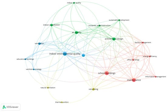 The dataset denoted as “Set 3”, containing keywords such as “maintenance”, “strategy”, and “educational building”, comprises contributions from 15 distinct author groups, collectively generating 15 documents, encompassing articles, conference papers, and reviews. These groups created 15 clusters, each independently formed without interconnection, indicating diverse research trajectories (Figure 6). The visual representation of the keywords associated with “Set 3” publications is presented in Figure 7.