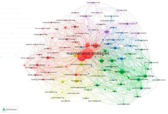 Following this, an examination of the keywords presented in “Set 1” publications was conducted. Given the modest size of “Set 1”, comprising seven papers, a minimum occurrence threshold was set—each keyword was required to appear at least twice. Out of 20 keywords, associations with the term “maintenance” were identified (keywords such as, among others, “maintenance cost and budget”, “maintenance strategies”, “maintenance cost”, “repair”, or “facilities management”). The visual representation of these associations is depicted in Figure 3, illustrating the interconnectedness within the maintenance cluster.