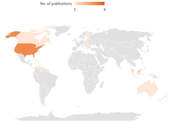 Most publications connected to maintenance and university buildings were affiliated with universities from Taiwan, Malaysia, and other Asian countries (Figure 11). This topic is not really popular among European researchers; however, a publication from Portugal was also found. The collaborative efforts of researchers from the National Taiwan University have significantly enriched scholarly discourse, offering innovative solutions and invaluable insights into sustainable building maintenance and management practices. Such interdisciplinary endeavors exemplify the multifaceted nature of contemporary civil engineering research and underscore the importance of global collaboration in addressing complex challenges within the built environment.