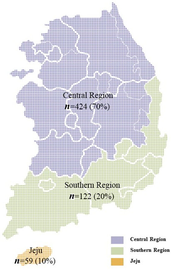 An online survey was conducted for six weeks, from September 2021 to October 2021, targeting married women living in residential buildings and experts working in educational and research institutes in the field of building environments and systems. Married women were selected as the general respondents of the public to assign one respondent for each household, which avoids the duplication of respondents. Married women in their 70s or older often live with their children or in nursing facilities; hence, the target age of the participants selected was between 20 and 69. The number of respondents was n = 605 for the public survey. The number of respondents by age was set as 10%, 30%, 30%, 20%, and 10% for respondents in their 20s, 30s, 40s, 50s, and 60s, respectively, considering the population ratio of married women by age in Korea [32]. The regions of the respondents were determined according to the classification criteria for the thermal insulation standard of exterior walls and windows by region and were divided into central, southern, and Jeju (Figure 1). According to the population ratio of each climate zone in Korea, the number of respondents by region was set as 70%, 20%, and 10% in the central, southern, and Jeju regions, respectively [33]. The higher proportion of respondents in the central region was because this region is comparatively large (72,457 km2) and houses 69.9% of the population [34]. In contrast, gender and region were not fixed for the expert survey. University professors and researchers majoring in built environments and building systems nationwide were considered. We listed professors at domestic universities and researchers working at national research institutes and relevant companies. A total of 120 of these experts were approached through their emails, with 73 experts participating in the online survey.