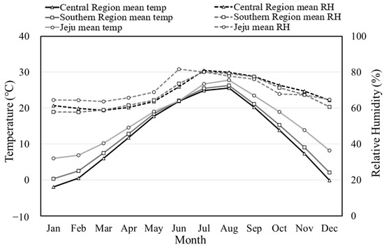 The overall climate of Korea has four distinct seasons: spring, summer, fall, and winter. Among them, summer is hot and humid, while winter is cold and dry, representing the most significant seasonal differences [35,36]. The average 10-year temperatures (2011–2020) in the central and southern regions of Korea, as well as Jeju, are 12.3, 13.6, and 16.5 °C, respectively. The monthly average temperature and relative humidity [37] are shown in Figure 2.