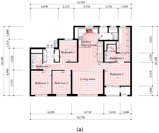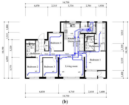 Layout of a typical 108 m2 residential household in Korea (with units mm). (a) Radiant floor heating pipe layout drawn in red line; (b) heat recovery ventilator and duct layout drawn in blue line.