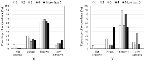 Figure 4 shows the sensitivity toward the indoor air environment according to the number of family members. Overall, 76.7% of the public and 87.7% of the experts answered that they were sensitive or very sensitive to the indoor air environment. Among the public and expert group, the percentage of respondents who answered “Not sensitive” was highest at 10% and 7.7%, respectively, when there was only one family member. Moreover, the public’s sensitivity toward the indoor air environment showed a strong correlation with region and residence time (p < 0.005), but no correlation was found in the case of experts (p > 0.05).