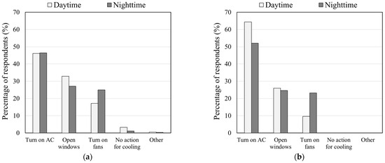 Figure 5 shows the survey response results for the first-priority action to reduce the heat in residential buildings in summer from the following: running the air conditioner (AC), opening the windows, running the fan, doing nothing, and others. The air conditioner was the preferred choice for both groups (46.1% (day) and 46.4% (night) for the public; and 64.4% (day) and 52.1% (night) for experts). Window opening was the second-most frequently selected behavior (32.9% (day) and 27.1% (night) for the public; 26% (day) and 24.7% (night) for experts). Both groups have a lower rate of window opening and a higher rate of fan use at night. Air conditioner use is 18.3% higher during the day and 5.7% higher at night amongst experts compared to the public, confirming that experts actively use the air conditioning system to combat heat compared to the public.