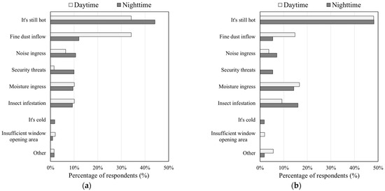 Figure 7 shows the results of survey responses on the reasons for dissatisfaction with opening windows in residential buildings in summer. Proportions of 34.2% (day) and 44.2% (night) of the public and 48.1% (day) and 48.2% (night) of the experts answered that it is ‘still hot’ even with open windows in summer. For the public, ‘fine dust inflow’ was ranked second with an average of 23.1%, whereas, for experts, thermal comfort due to moisture inflow was ranked second with an average of 15.5%. In the case of the public, it can be seen that there is great concern about the inflow of fine dust due to the opening of windows during the daytime. In the case of the experts, the reason for dissatisfaction with opening the windows was the decrease in thermal comfort due to the inflow of external moisture when the windows were opened in summer.