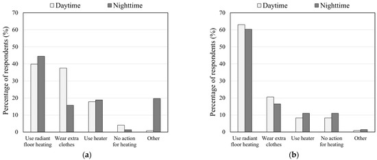 Figure 8 shows the survey response results for the first-priority action to increase heat in residential buildings in winter. Unlike summer, the opening of windows is limited in winter because of heating. Respondents chose one of the following actions to deal with the cold: running radiant floor heating, wearing extra clothes, using a heater, doing nothing, and others. The majority of residences in Korea are equipped with a radiant floor heating system. Depending on the resident, a fan heater, a radiant bar heater, a convector heater, and a heated blanket are also used. The public selected radiant floor heating at rates of 39.8% (day) and 44.5% (night); these are 63% (day) and 60.3% (night) for experts. Similar to the summer results, the use of the active system is higher amongst experts than the public to reduce cold. Wearing additional clothes (37.5%) was found to be almost equally preferable to radiant floor heating (39.8%) during the daytime by the public. As such, the public actively uses a passive control method that increases the amount of clothing in addition to an active heating system for thermal comfort during winter. There is a correlation between the first-priority action to address the cold during the day and night and the region (p < 0.05) in the case of the public, but no correlation is observed in the case of experts.