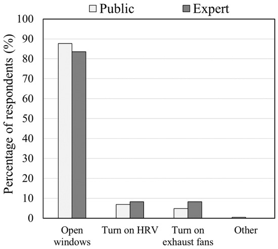 Figure 9 shows the survey response results of the main ventilation methods in residential buildings. Respondents chose from natural ventilation through windows, operating heat recovery ventilators (HRVs), operating kitchen and bathroom exhaust fans, and others as actions for household ventilation. Most of the public (87.6%) and experts (83.6%) chose opening windows as the main ventilation method. For the public, there was a correlation between the main ventilation method and the age of the window (p < 0.05), whereas, for experts, there was no correlation (p > 0.05). The heat recovery ventilator is selected only by 6.9% and 8.2% of the public and experts, respectively, while 4.8% and 8.2% of the public and experts, respectively, chose exhaust fan operation.