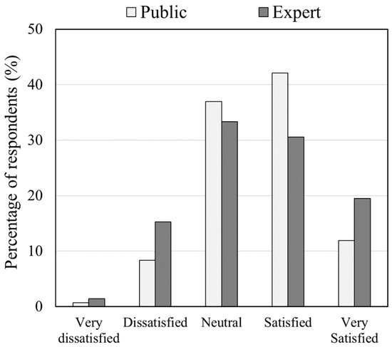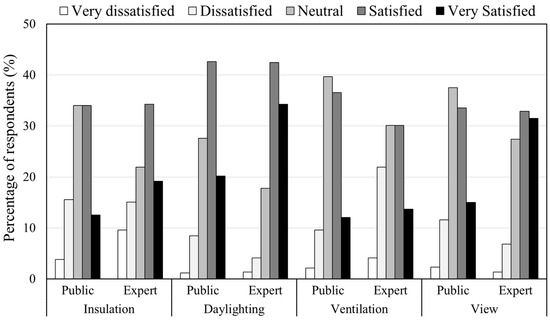 Figure 10 shows the satisfaction result when ventilation is performed by the opening of the window. The proportion of the public and experts who answered ‘dissatisfied’ or ‘very dissatisfied’ was 9% and 16.7%, respectively; the dissatisfaction rate was 1.9 times higher among experts. However, the level of dissatisfaction was lower than those of the public (22%) and experts (44.4%), who were dissatisfied with opening windows to relieve the summer heat.