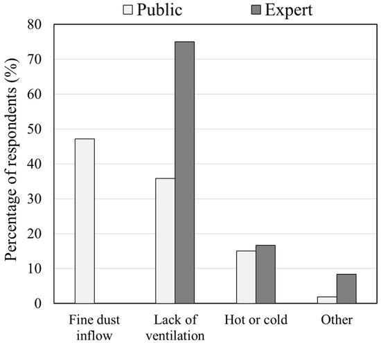 Figure 11 shows the survey response results on the reasons for the dissatisfaction when opening the windows for ventilation. The public answered with the inflow of fine dust (47.2%) as the main reason for dissatisfaction, followed by insufficient ventilation (35.8%). In contrast, experts answered with insufficient ventilation (75%), followed by thermal dissatisfaction (16.7%). Unlike the public, experts did not respond to the inflow of fine dust as a reason for dissatisfaction with the window opening. As such, the public perceive the inflow of fine dust as the main obstacle to opening windows for ventilation and heat movement.