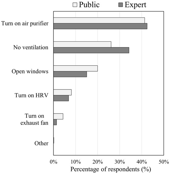 Figure 12 shows the survey response results on the main ventilation methods on days with severe external fine dust. Respondents selected from air purifier operation, no ventilation, open windows, operating the heat recovery ventilator, operating exhaust fan in kitchen and bathroom, and others as the ventilation method on days with high external fine dust concentration. Overall, operating air purifiers ranked first at 41.9. No ventilation took second place with 30.2%, and even when ventilation was performed on a day with severe external fine dust, ventilation by opening the windows (17.5%) was more effective than operating the heat recovery ventilator (7.5%). For both groups, the main ventilation method on days with severe external fine dust was not found to be correlated with area or residence time (p > 0.05). The public showed a strong association (p < 0.005) with the main ventilation method and the level of sensitivity toward indoor air quality on days with severe external fine dust, whereas the experts did not.